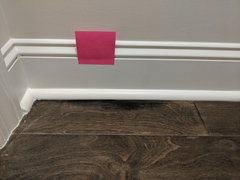 Original Author6 years agoThe builder now has removed two places of drywall and trim to see if water was in the walls, which it was not. Evidence of moisture behind the baseboard with more mold was visible. He said he had never seen anything like this and said now we have to wait to call in the Manufacturer of the Engineered Hardwood Floor Company. These moisture areas are on the left side and the front of the home. However when he started reading moisture levels in the center of the rooms they were even high now. We have no active water leak and no water damage signs anywhere but along the edge.