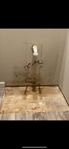 Original Author6 years agoJust wanted to give an update on this since so many of you had ideas on what the issue could be. Since the last post we just last week had the drywall removed, new drywall installed, a new cabinet and hooked everything back up. It was under the builders impression that the issue was still caused by the constant fan. However, shortly after the last post we discovered that our Septic Tank was never turned on. It began overflowing into the backyard, which is right behind the side of the home with the moisture issue. We were concerned about why the septic pump alarm never went off and that was because it was never connected by the electrician. We moved in last November so it was off for that whole time. We never noticed back up toilets or any odors or even the toilets making bubbly noises. We got that hooked up correctly and it started working. Last night when I was cleaning my sons room I noticed the edge of the wall on the hardwood flooring had water stains that were solid black. We have the Chesapeake Bay Gray Fog Engineered Hardwood flooring thru-out our whole first floor except for the wet areas where we have tile. The black spots we noticed are the same spots that had high moisture readings when we noticed the mold issue. The builder said the two issues werent related and that we would deal with the moisture after we took care of the mold issue. Since I have looked into all of these possible solutions, my only idea of what could have caused all this is the flashing on the home. It looked correct when they removed the brick on the side of the home but it has to have gaps in places that allowed water to leak in. the water spots are about every two feet away from each other in my youngest sons room and we found one spot in the dining area which is on the front of the home and then in the bedroom next to the bathroom that had the mold. Thank you for all of your help researching and figuring it all out.