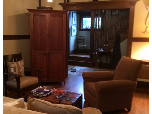 A Craftsman-style living room gets lightened up, giving a family some space to gather and play