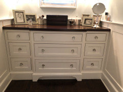 A ‘beauty bar,’ marble-lined steam shower and laundry chute are a few of the amenities in this glamorous spa bathroom