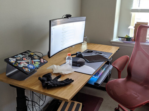 Decorating a home office with beige carpet, bamboo desk and red chair