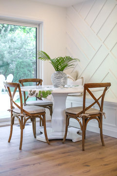 Turn an awkward area into a graceful scene with low seating, a pretty wallpaper, just-right tables and more