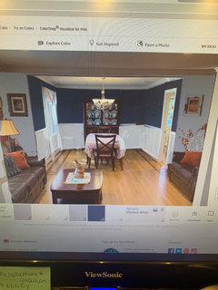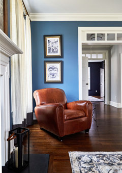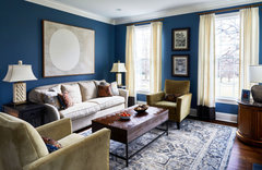 This home's colonial architecture inspires formality, while the room's bold color, a mix of styles and a glossy bar update the look