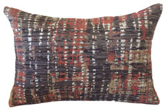A modern blue, gray and orange rug is at the center of a redesign that embraces the homeowners’ art collection