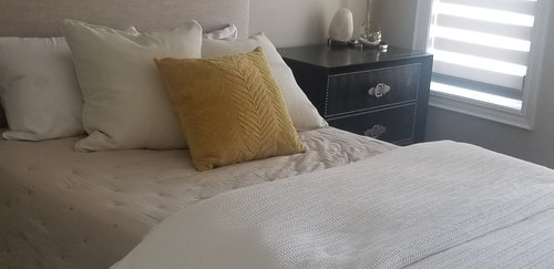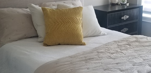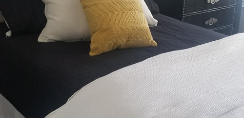 Serene but not boring, these linens, accessories and decor will make your guests glad they skipped the hotel