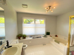 A designer uses a light palette and hardworking cabinetry to update a couple’s 1970s hallway bathroom