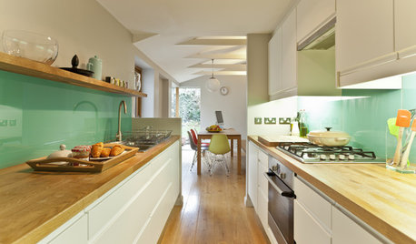 Garden access and a bright green backsplash bring color and light to this British kitchen — and the new dining room opens things up