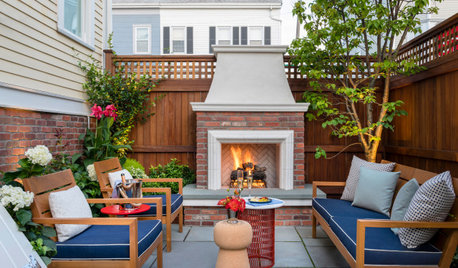 Tight on space, big on style, this 15-foot-wide Boston patio has an outdoor kitchen, dining area and fireplace lounge