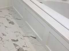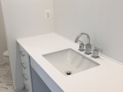 My tub with quartz top. You can see how the quartz is not as white as the countertop.