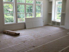 Original Author5 years ago@Ashley Your floors look beautiful. Your house lay out seems very much like ours! We have one big space — kitchen, then dining area with doors to exterior, then the family room. We also added the clerestory windows like you did. Here’s a photo of our family room. I haven’t figured out if I’m going to use any window coverings yet. Curtains will block the bookcase. (I didn’t think about this before adding the bookcases.) I don’t want to hide the clerestory windows with coverings and don’t like the strings that show with bottom-up shades (maybe OK for the bedrooms). Maybe I will just buy new bathrobes for me and DH instead. We got our hardwood lumber from a lumber mill in Berryville, VA. They bring in wood from various locations. Ours is from Norway. They were great to work with. Very patient. Brazilian Floors did the installation and finishing. They did a great job. BTW, we used Corian — old fashioned solid surface Corian in our kitchen and in 2 bathrooms. (Thank you @Joseph Corlett for giving me the confidence to use Corian and to Heartwood Solid Surfaces for doing the work.) think it turned out well.