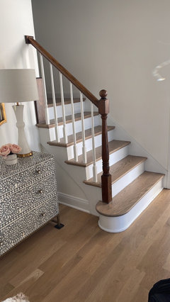 It’s hard to capture the color of the floors accurately in the photos. There is zero orange or amber in the floor color but the photos make it look as though there is a slight orange hue. We opted against replacing the red oak stair treads with white oak treads as there are 13+ treads and it would have been a super expensive project (will end up getting a runner over the stairs anyway so a lot of the step will not be visible).