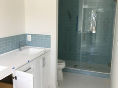Below — Jack and Jill bath with Corian countertop AND Corian integrated sinks. Blue tape is where some contractors messed things up. The tile on the back wall of the shower and the backsplash is a soft baby blue glass. (Side shower walls are white).
