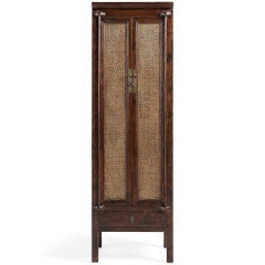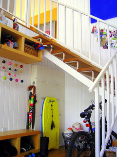 A space-savvy cabinet, bench and shelving unit near the entry help a busy New York family stay organized