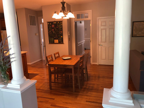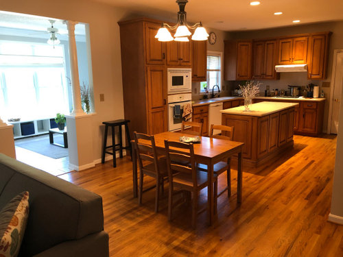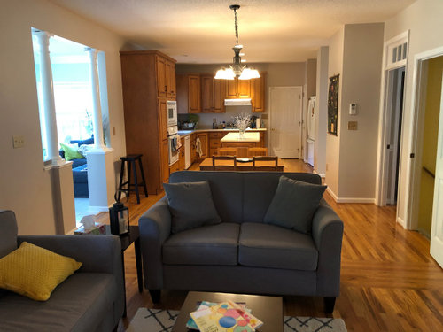 Awkward living room to kitchen open concept -- help!