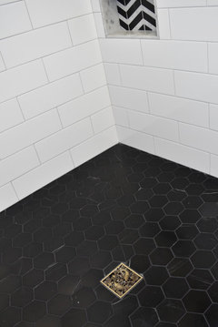 Playing with stripes, angles, tones and more can add drama to your shower enclosure