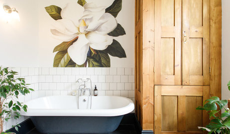 BATHROOM MAKEOVERSA Simple Bathroom Gets a Lift From Warm Wood and a Flower Mural