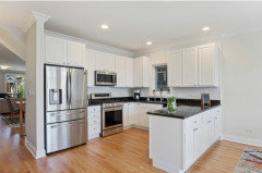 Knocking down a wall and raising the ceiling allow for a spacious kitchen with stunning lake views