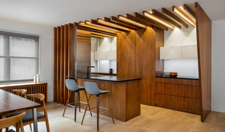 An architect opens up a nondescript galley kitchen to create a sculpted walnut centerpiece for a New York City apartment