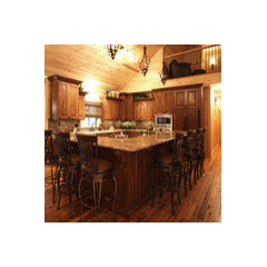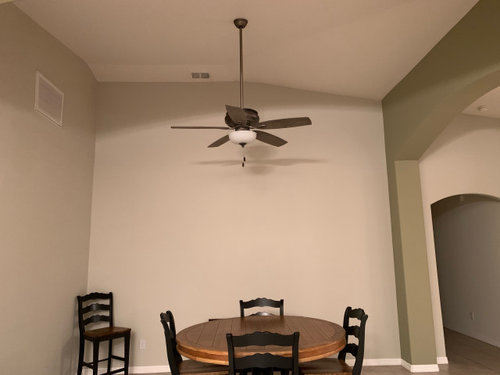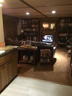 On the inside.....once again...reasons for everything...LOL...I'm ( personally ) NOT a fan of ceiling fans...however in YOUR climate, central air is crucial and vents are at ceiling height of walls, so fans are used to PUSH that cool air down to circulate thru the area...THEY are needed, BUT you can change out the LIGHTS at the bottom of them to make your rooms have a more "rustic" look / feel....learn to work WITH things but "tweak" them as to styling...haha....I would ask you to please scroll back up to beginning of ALL these comments to where Beth H posted 4 pics......Numbers 2 and 4 are typical "rustic / cabin" types and AWESOME examples of things you could do in your home.....A chandelier similar to one in #4 could be used in your front entry.....the fireplaces in these pics are done in stone....YOUR fireplace could be "faced" in similar stone and with addition of a wood mantle, would achieve the look you want....you COULD even take it a step further and "face" the bottom of your breakfast counter ( since it faces the living room ) with the same stone, thereby "unifying" the space.....addition of dark wood ceiling beams would be great, too !! Real wood floors would dry out and look horrid in time....but there are tiles that LOOK just like hardwood floors, and I would replace the wall to wall carpeting with those to achieve the look you desire....For visual continuity, LOSE the "built-ins" to either side of fireplace and replace them with matching cabinets that are LOW, so you can put a large TV on the one to the right side.....You COULD also make the wall opposite the fireplace ( other side of front hall ) a "statement" wall with the addition of wood "planks" and THAT would give you the "rustic" look, too.....the reason Pic #4 looks sooooo cozy and has a rustic feel is the addition of "accents"....lots of pillows and a throw over the couch or a chair....you have the "bones" of the space, just need to "tweak" it with YOUR personal touches here and there !!Sue thanked ravensmom13 - 5 years ago