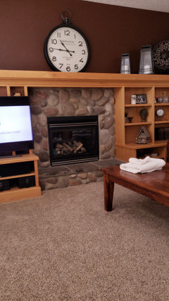 We bought this house with amazing views from the living room windows. We are willing to add wood, stone, remove shelves, add paint to make this look like a woodsy retreat. We would also like to have a large TV next to the fireplace somewhere, but not above it. Thanks!