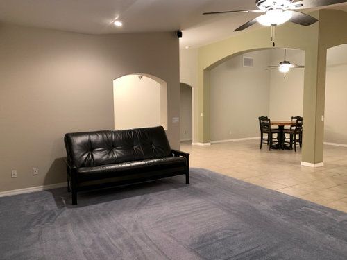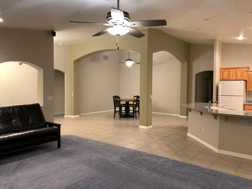 There is a wall dividing the livingroom and the entry. Do you know if that is load bearing? I don't see where it serves any purpose and it will give the room more of an open feel if it is taken down.Elsewhere would you be able to square off the arch openings throughout. They don't offer any visual design points and makes the ceiling seem lower.
