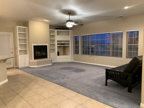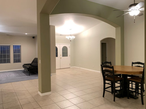 If you need to keep the existing tile, try to work WITH it and your kitchen cabinets to get a more cohesive look. The built-ins around the fireplace add visual clutter, compete with the fireplace and the windows, and don't hold a modern tv. I would remove them and replace the blue carpet with a neutral, textured carpet that complements the tile. A rustic tv console, perhaps in deep turquoise, on the right of the fireplace, and a tall, green plant in a terracotta or turquoise pot on the left, with art over the fireplace. Linen colored sofa facing the windows with a multi-colored throw and accent pillows. Terracotta leather chair, or two if there is space, facing the fireplace/tv. Oak and iron coffee and side tables. Low rustic bench or armless chairs below the windows. Woven wood blinds, maybe, for a more warm and rustic lean? Iron or dark oak barstools at the island and add some ORB pulls to the kitchen cabinets. The counter tops look gray on my monitor and clash with the floor tile and cabinets. A stone without so much gray would work much better to tie all of the big elements together. In the dining area, paint over the green in the same color as the rest of the space. A rustic iron and/or wood chandelier over the table, a sideboard with open shelves over it, colorful small accents, and a patterned area rug would help make it more inviting and not feel so disjointed from the rest of the space. Replace the light in the entry to coordinate with the new DR fixture, and put a rustic console and mirror along the wall there. Paint the inside of the front doors a deep, distressed turquoise. For art and accent pieces, I would try to use terracotta, turquoise, caramel, pine green, etc., colors that are more rustic and that work with the kitchen cabs, and then add iron, wood, baskets, plants, and other natural textures to bring it to life. Some of the pictures in previous posts contain many of those things I am suggesting. I think you have a nice space to work with, but the former owner chose colors and styles that do not work together! Good luck and have fun with your new home!