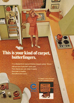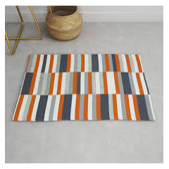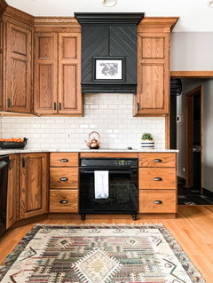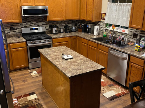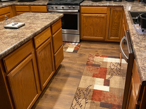 Need advice on what color rugs would help tone down orangish cabinets