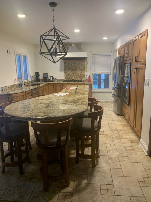 A design-build firm found on Houzz updates a couple’s kitchen with rich color, a roomy island and a statement range