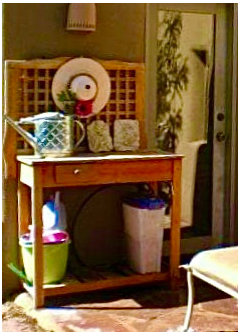 For our Back Portal, essential was comfortable seating with a big enough table for entertaining. And, sturdy enough that our canyon winds wouldn’t blow them over. And a gas grill. And my birdbath and feeders. Splurge was our small but pricey wood rack with a kindling holder for out there, as the back portal opens into our family room with a fireplace. After so many years of DH keeping a messy pile of firewood out there I finally splurged on a nice small rack to hold it.