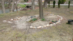 Right now our main "utility" concern is drainage of various types, keeping moisture away from the house and repairing areas that have been damaged or neglected. But along with it, creating nice areas to look at once we are using the spaces. Here's my "big project." The rock mulch was killing the tree and also not all that attractive. But digging them all out is proving to be laborious. This is the main view in the backyard. The right side is what I have finished as far as rock removal, the left side is what's still to finish. You can see some black bits of plastic pushing up on that side in the back. I covered the right side with bark mulch at the end of last season. So this spring, back to rock sifting . . .