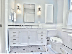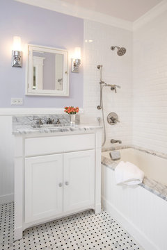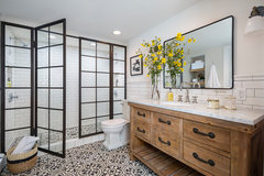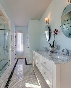 A designer helps a California homeowner transform her dated bath with a lighter color scheme and classic design details