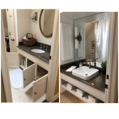 You can build storage, seating and more into the area between vanity or pedestal sinks
