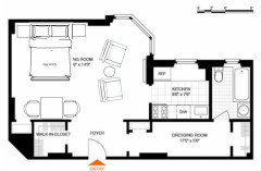 Use the entire area from bathroom window to hall wall (right of entry now shown as dressing room) as BOTH bathroom and dressing room by putting the toilet and vanity and (preferably a walk in style) tub/shower combination -- all three along that right wall. Except for where you put a pocket door to the bath/dressing room in that wall between the bathroom and the rest of the apartment, create wall to wall floor to ceiling cabinets across from the toilet, vanity, tub/shower and let the wall be clothes storage and the longer (perhaps wider) space between the vanity and clothes storage be the dressing room -- no need to use up separate space for a dressing room.
