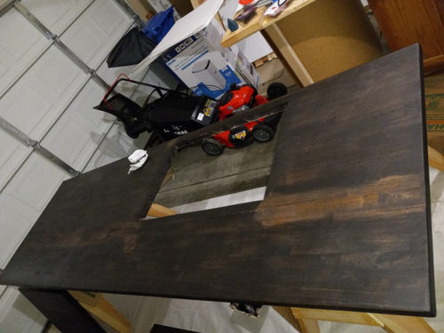 First of all, I am fully aware that I royally screwed this up. My husband and I built this countertop by joining two slabs of butcher block that we purchased from Home Depot. This was our first attempt at any kind of woodworking, and our first attempt at staining. So, lots of learning curves to navigate. Here is a run down of how we got to the point where there is an uneven stripe across the length of the piece (it looks even worse in person, sadly):