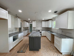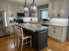 An Asian-inspired island, newly stained floors and white cabinets complete the look