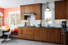 Hand-poured terrazzo pairs well with wood cabinets in this kitchen and dining area designed for entertaining
