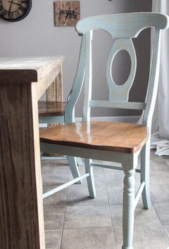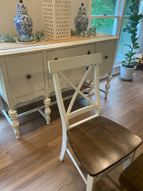 how do I make these chairs look less farmhouse and more grand mill?