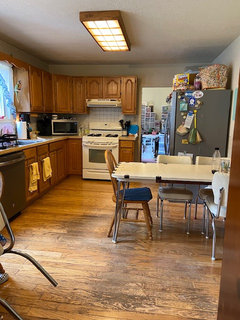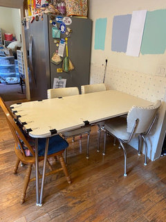 So here are a few pictures of the kitchen. Thank you guys both for your suggestions and ideas. It is a mess as we have started demo on one end already. The table space in the kitchen is technically supposed to be under the window, however, our family of 5 didn't fit there to get in and out from the table easy. We moved it to its current location so that no one was "trapped" in their seat. The dining room is currently being used as an office but that wont be forever. The kitchen table is my Grandmom's vintage 1940-50's table that I am restoring. I love it even if it won't really fit into the new kitchen style wise. The table I had there previously was the same length but much wider. This one fits better for sure and I expect I will always have a table in that location. We do plan to recess the fridge into the wall.