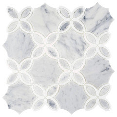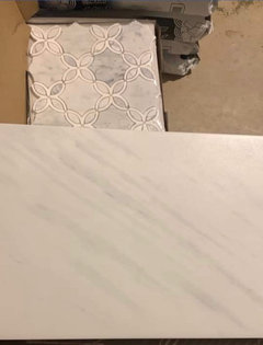 Beautiful marble mosaic tile, periwinkle paint and light-colored finishes brighten a once-dark space