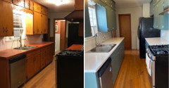 A copper sink, walnut island and matte black finishes bring warmth and style to a once-dated space