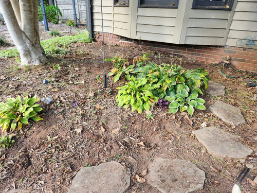 All of the hostas you see are repurposed from my other gardens, so I haven't had any problems with keeping them healthy. They seem to do well in this area with 0 attention!