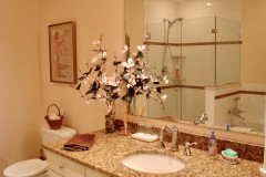 This now-airy Whidbey Island bathroom features a soaking tub, a walk-in shower, heated floors and an expanded water view