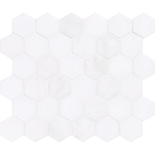 Beautiful marble mosaic tile, periwinkle paint and light-colored finishes brighten a once-dark space