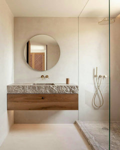 Rustic wood tones, rich colors and floating units show up in the top bathroom photos. Which looks do you like best?