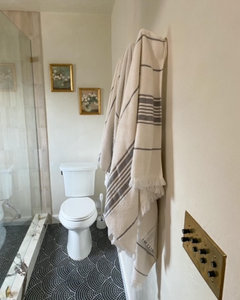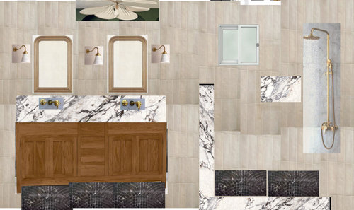 Colorful vanities, shiplap walls, interesting tile and classic light fixtures elevate these striking new baths