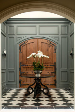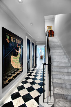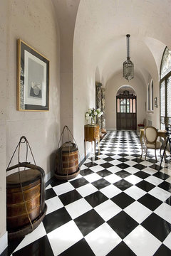 Use patterned black-and-white tile on floors and walls to bridge the gap between traditional and modern looks