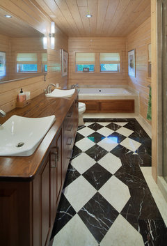 Classic, affordable and widely available, this tile combination can veer modern, traditional or eclectic on a bathroom floor