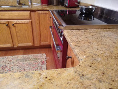 The depth of the F-P cooktop comes just about even with my counter and the finished side of the appliance sit proud of the cabinetry beneath, but not by very much. (My old GE coil had about an inch of side black side panel exposed, plus the oven door that sat proud of the chassis.) I took a sideview shot so you could see how it looks.