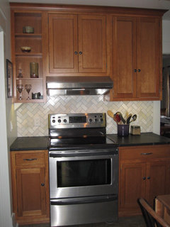 Here is my current setup, though its never this clean, lol. These are pics from 2011 when the kitchen was finished. I tiled down to the counter line behind the range, and up behind the vent, before it went in. My kitchen is Small. The room also has 4 doorways taking up valuable wall space! The fridge & pantry are in the entry/mudroom seen through the doorway window in the 2nd pic.