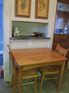 Turn around from the range, and this is the other work space/kitchen dining area. It works and we can get 4 people around here in a pinch. the dining room holds up to 12 people and is only 8 steps away. This was the new cherry table & chairs I had custom made in 2012. I still love it.